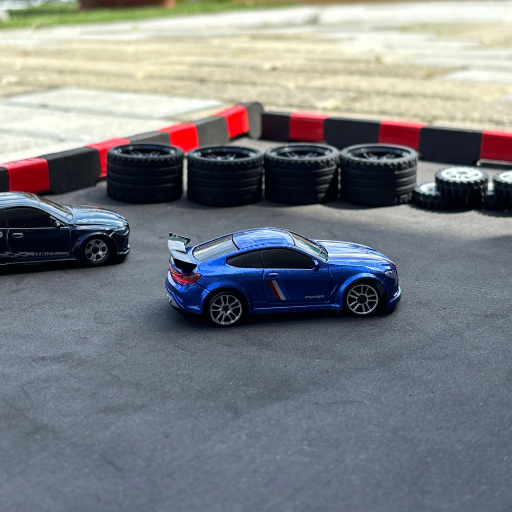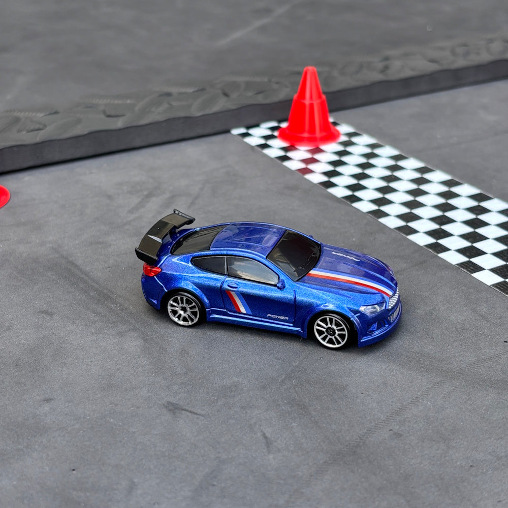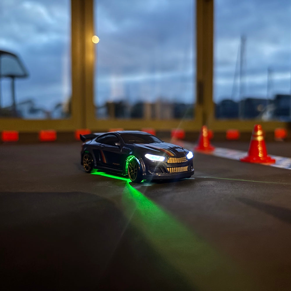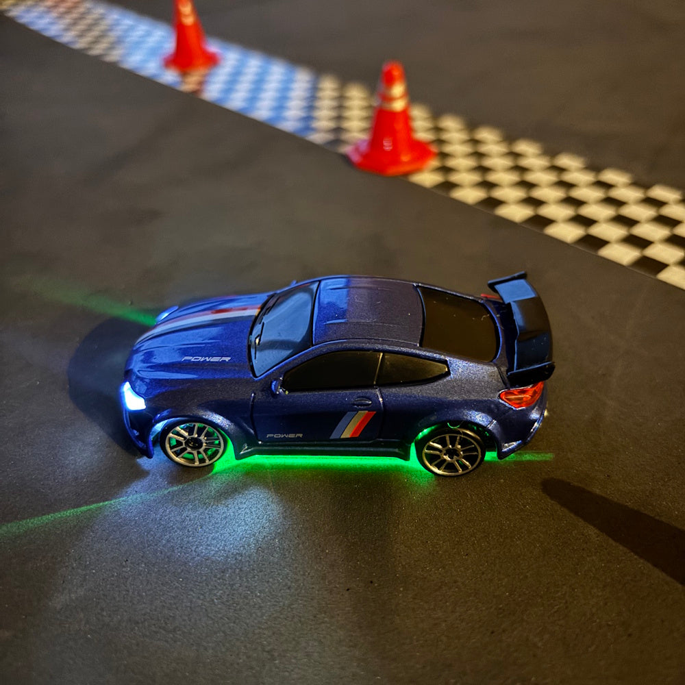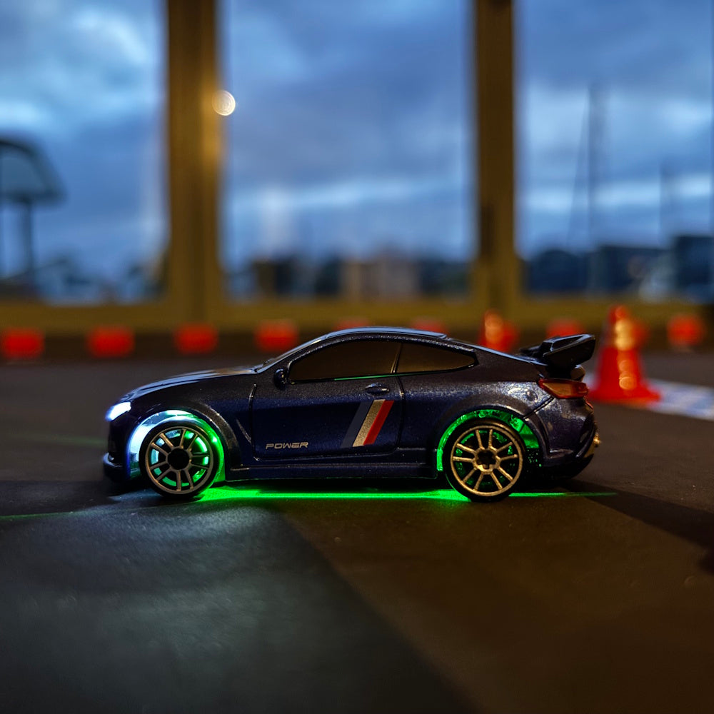 Restyle of Type B 1/64 Drift Car – included body restyling, green underglow. The car is slightly more tuned for racing, specifically, electronic assistance in exiting the skid was removed.